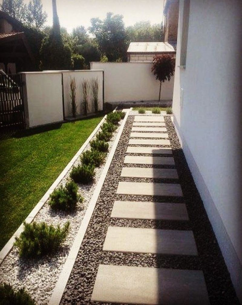 Сучасний вільний стиль садового дизайну – тротуарні плити, встановлені на гравійну доріжку. Така концепція робить доріжку візуально більш гармонійним. Практичність плит і зернистість гравію успішно доповнюють романтичну атмосферу саду.