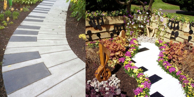 Садова доріжка у вигляді клавіш піаніно вийде, якщо розфарбувати саму доріжку в білий колір, а «клавіші» виділити чорним. Також можна використовувати гальку різного кольору на гравійної доріжці. Діти і музиканти однозначно будуть у захваті!