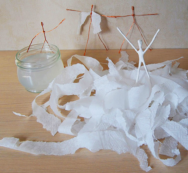 2. Білі серветки розірвіть рука на довгі смужки. Змочуючи їх в клейстер, обмотайте вологими серветками каркас балерини. Потрібно накладати стільки шарів серветок, щоб каркас зовсім не було видно. При необхідності зверху нанесіть клей. Добре просушіть фігурку.