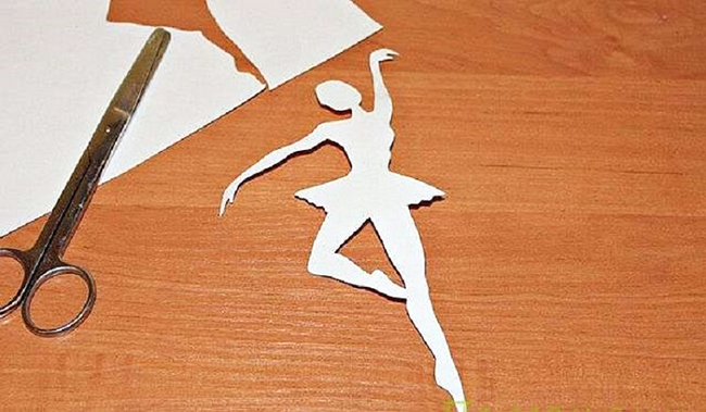 2. Візьміть білий аркуш паперу і складіть його так, як робите новорічні сніжинки. У центрі зробіть проріз, щоб сніжинка стала пачкою для балерини і її можна було надіти. Як спідниці для балерини може стати тюль, або інша будь-яка легка тканина.