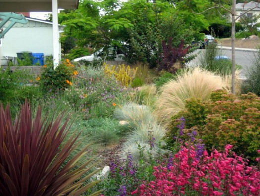 Японський стиль також передбачає знаходження натуральних каменів, В поєднанні з хвойними рослинами. А якщо висаджувати рослини в квітники, то бажано багаторічні, такі як лилейники і іриси, можна робити акценти зі злаків (костриця сиза, райграс).