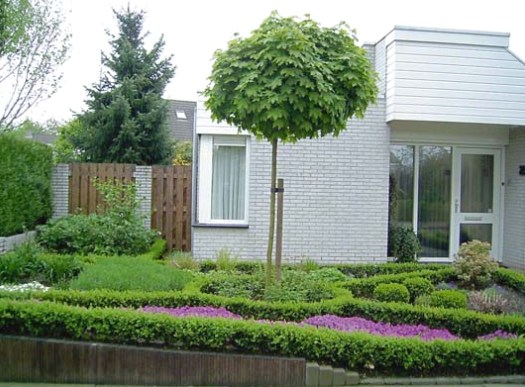 З деревних рослин найбільш часто застосовуються штамбові, навколо яких можна організувати пристовбурні квіткові композиції. Наприклад, клен гостролистий, «Куляста», або штамбові туї західні.