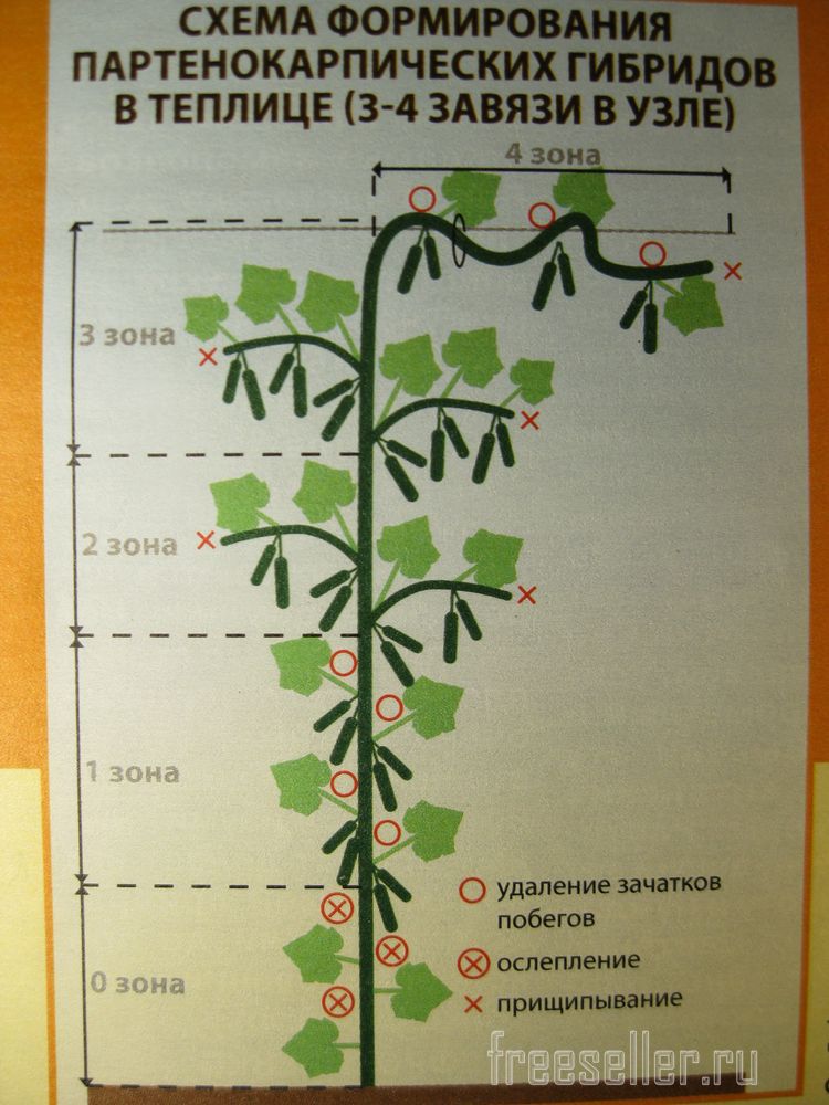 Щоб ваша теплиця не перетворилася в непролазні джунглі, а рослини не витрачали поживні соки на нарощування додаткової вегетативної маси, прищипують бічні пагони. Залишайте на кожному саджанці не більше 3-4 батогів. Цього цілком достатньо для формування численних корнішонів.