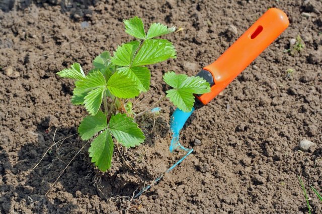 Під кожну рослину викопується ямка, глибина якої повинна бути такою, щоб коріння полуниці легко в ній містилися. Якщо вони занадто довгі, їх можна трохи вкоротити, від цього коріння будуть кущитися ще краще. Перед висадкою грунт в лунках слід злегка зволожити.