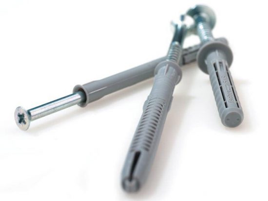 Як елементи тут можна використовувати дюбелі з пластика, що використовуються при роботах з цегляними стінами. Вони мають спеціальні виступи, які не дають їм провертатися під час вгвинчування шурупа. При закручуванні в такий дюбель самореза або вбивання цвяха, він як би згортається в вузол, завдяки чому займає всю порожнечу.Тому – для цегляних стін це дуже надійне кріплення, на яке можна без побоювання повісити кухонну шафу будь-якої ваги.