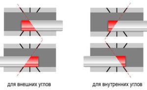 - Після того як розміри визначені, треба розмітити лінії на плінтусі та провести різку. Тут важливо встановити плінтус в стусло так, як годиться, якщо ви щось переплутати, що зіпсуєте виріб. На схемі нижче показано, як виставляти планки правильно при різанні стиків внутрішніх і зовнішніх кутів, використовуйте малюнок як підказку при роботі;