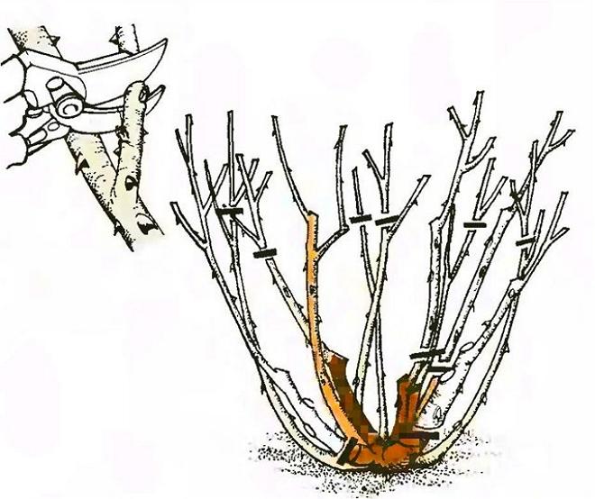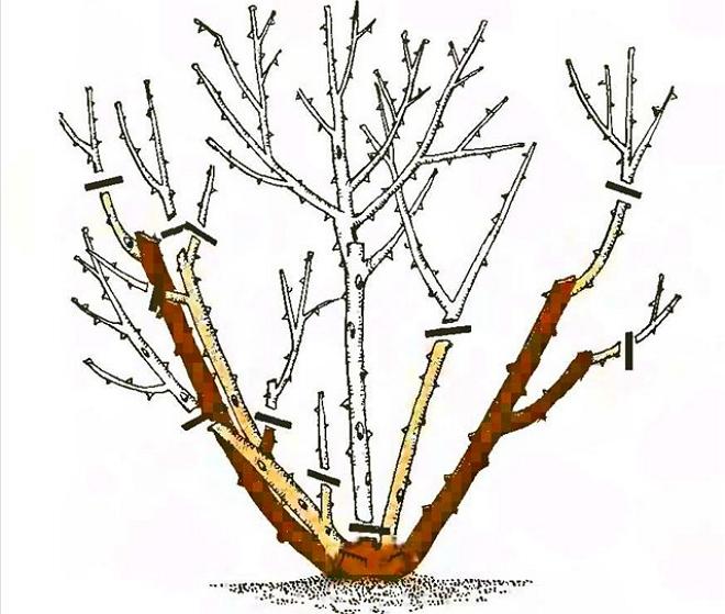 На молодих бічних гілках залишають по 2-3 нирки, а на старих – по 3-5 нирок. При цьому старі стебла, що ростуть в середині куща, повністю вирізують.