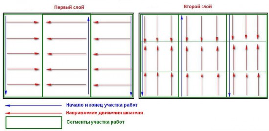 Нанесення складу зручно починати від правого кута стіни. Варто стежити за товщиною нанесеного шару – він не повинен перевищувати 2 мм.