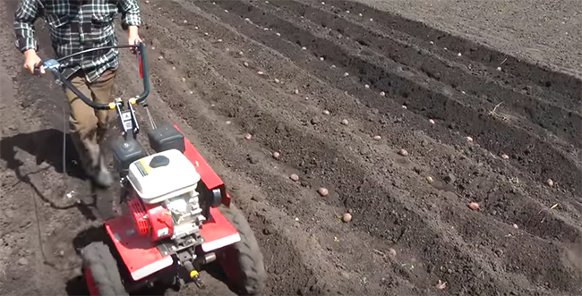 Мотоблок при такій посадці повинен працювати на першій швидкості. Колесо, яке котиться по ровку з картоплею не травмує його.