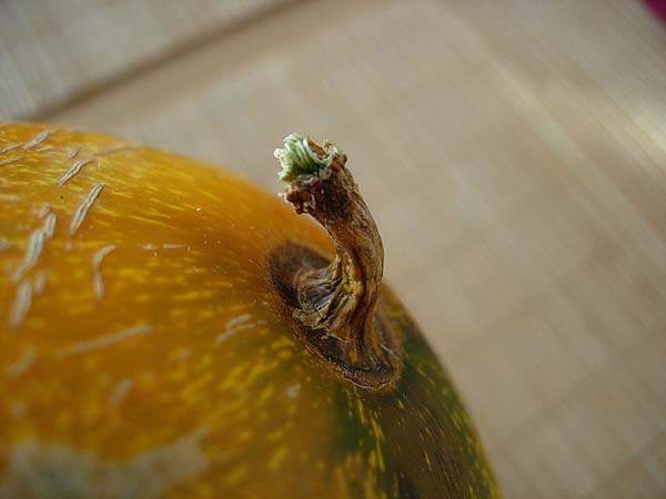 - Зверніть увагу на носик плода (це те місце, де раніше була квітка). Існує таке оману, що чим більше слід від квітки, тим смачніше вона буде, так як це дівчинка. Насправді ж, все дині – дівчатка, так як тільки з жіночого квітки може з'явитися плід (чоловічі квітки потрібні тільки для запилення). Однак, слід помацати цей носик, він повинен бути злегка м'яким і трохи пружинити. Якщо він жорсткий, то динька не дозріла, занадто м'який – перезріла або занадто довго зберігалася.