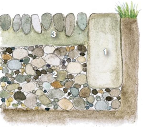 - для стійкостінастилу потрібен бордюр (наприклад, ізбрусчаткіілі валунів). Якщо візерункове покриття буде піддаватися підвищеному навантаженні, окантовку встановлюють на цементний розчин.