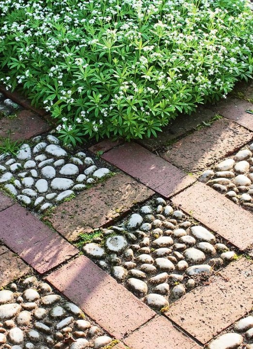 Незвичайність цієї майданчику, вимощеній бруківкою, надають цікаві вставки з білого гравію. Такі вкраплення можна використовувати також для ефектного оформлення настилу тераси з плит.