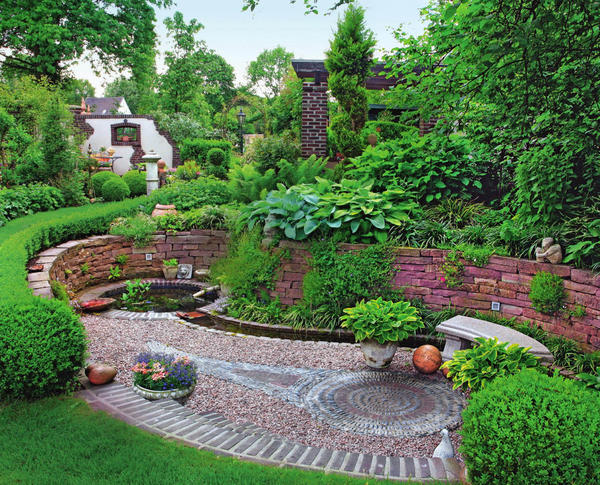 Поруч з кам'яними білими квітками струмують стрічки червоного, коричневого, бежевого, сірого і чорного гравію. Такий химерний малюнок надає садовому пейзажу витонченість і вишуканість.