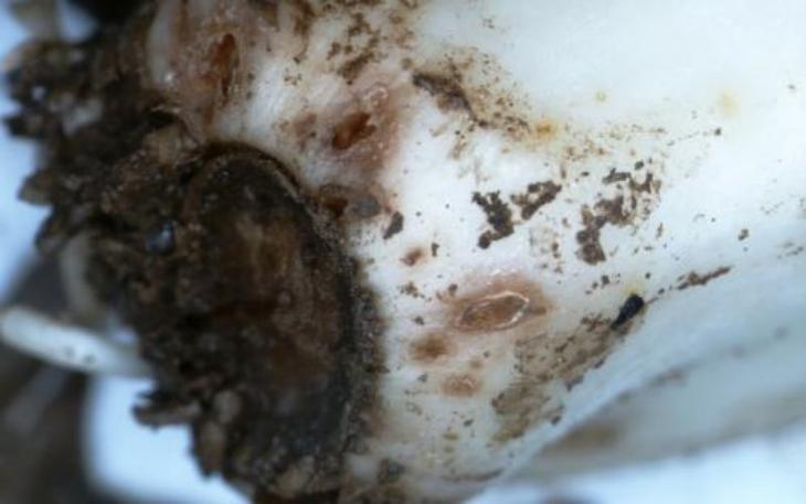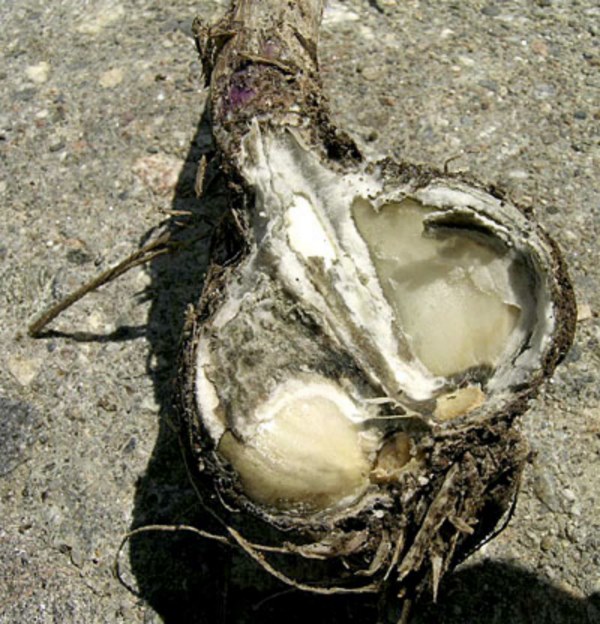 Грибкова хвороба, яка також проявляється не тільки на зростаючих рослинах, але і при зберіганні. Захворіла рослина з відкритого грунту закінчує своє життя відмиранням коренів, а починається з пожовтіння листя. Склероції грибка зимують в землі і заражених голівках часнику. Біла гниль набирає більших обертів при + 18-20 ° С.