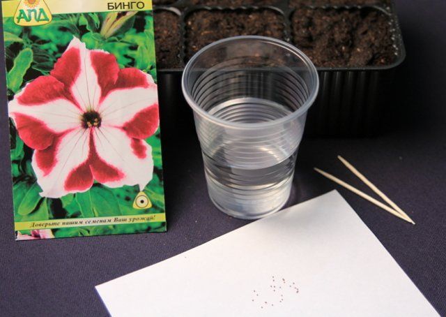 Насіння петунії (зручніше користуватися тонким пінцетом або зубочисткою) висівайте на поверхню обробленого, остиглого і вологого грунту, зверху грунтом не присипати. Якщо ви використовуєте дражировані насіння, то для успішного розчинення гранул слід додатково обприскати їх вже на грунті водою з пульверизатора (не з лійки! Інакше насіння може надмірно глибоко зануритися в землю).