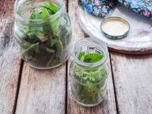 - Беремо скляну банку або будь-яку скляну ємність і заливаємо м'яту спиртом