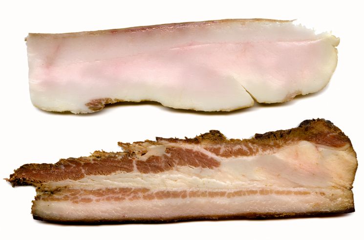 - Свіже сало обмити, зачищаючи шкуру. Дати йому стекти і обсушити паперовим рушником. Нарізати однакового розміру прямокутними порційними шматками, хоча допустимо і цілим пластом.