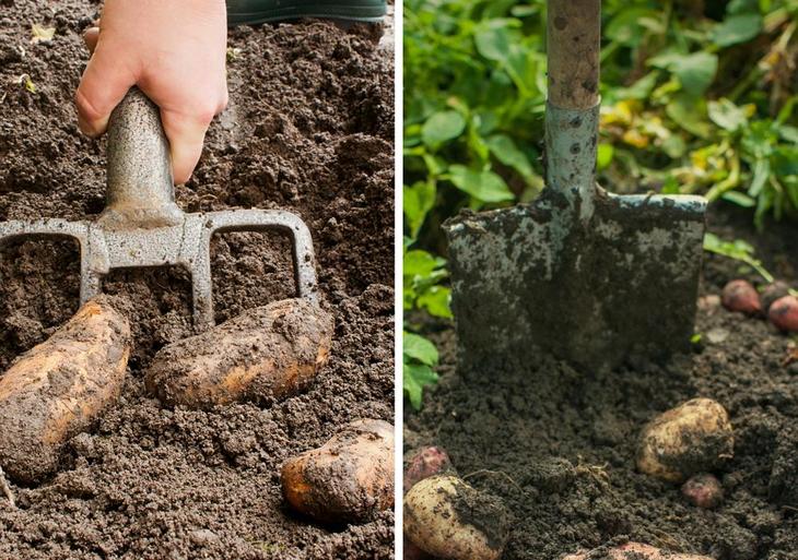На щільному грунті кущі слід підкопувати збоку. Робити це можна вилами або лопатою. У кожного з інструментів свої переваги і недоліки. Вилами легше викопати ціле "гніздо" бульб, не пошкоджуючи при цьому урожай. Але якщо вже вила проткнути картопля, то такі екземпляри довго зберігатися не будуть. При використанні лопати ризик пошкодження бульб збільшується. Однак зрізи від лопати на повітрі швидко завітрюються, і така картопля зможе якийсь час пролежати в погребі.