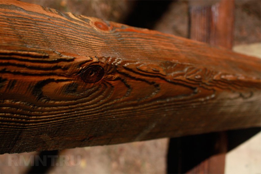 Для цього потрібно позбутися від пухких волокон на поверхні дерев'яного виробу, і зафарбувати матеріал спеціальним складом. Додатково можна покрити його захисним лаком. Це дозволить міцно зафіксувати красиву фактуру. Такі типові ознаки старого дерева, як затемнення, вигнути і ямки – видозмінять декор інтер'єру до невпізнання.