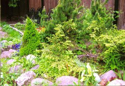 Ефектною прикрасою для будь-якої зробленої альпійської гірки своїми руками послужать низькорослі чагарники, наприклад різні верески і кизильник горизонтальний, а також декоративні форми хвойних порід – ялівці, сосна декоративна, туї.