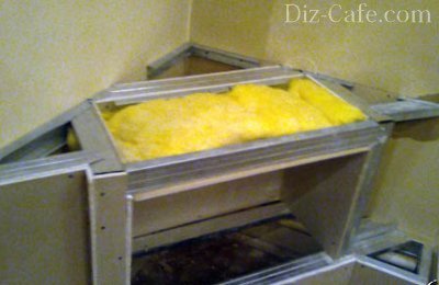 Сам каркас зовні обшивають гіпсокартоном, прикручуючи його на саморізи через кожні 10-15 см. В області топки прокладаємо 5-ти сантиметровий шар мінеральної вати