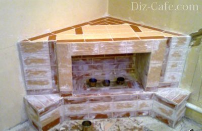 Обшиту гіпсокартоном конструкцію зашпакльовуються і облицьовувати кахлем, вогнетривкої плиткою або природним каменем, який органічно поєднуватися з іншими елементами зони відпочинку