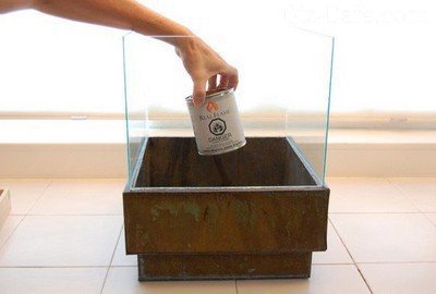 У центр металевого короба встановлюємо банку, наповнену паливом. Якщо для облаштування біокаміна використовуємо дві і більше пальників, то їх розміщуємо в коробі на відстані 15 сантиметрів один від одного