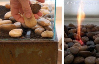 З шнурка скручуємо гніт і занурюємо один з його кінців в ємність з паливом. Саму металеву сітку вкриваємо жароміцними камінням, декоруємо керамічними полінами і іншими негорючими матеріалами.