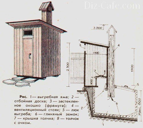 Схема пристрою дерев'яного дачного туалету з герметичною вигрібною ямою, вентиляційною трубою, що відводить неприємні запахи, люком для утилізації відходів