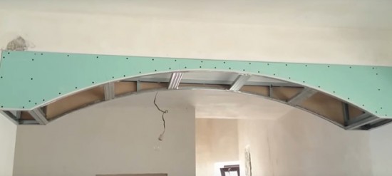 Після того як каркас арки встановлений, його потрібно обшити гіпсокартоном. Починайте з бічних частин: саморізами прикручуєте до металевих напрямних заготовлені полотна з кроком з 15-20 см.