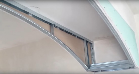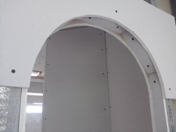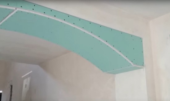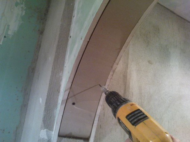 Далі необхідно закріпити гіпсокартон на зігнутому верхньому профілі. Це найскладніша процедура, так як матеріал, з одного боку, погано гнеться, а з іншого – може швидко деформуватися при силовому впливі. Кращий вихід із ситуації – трохи намочити гіпсокартон і, обережно згинаючи, підганяти під каркас. Коли необхідний радіус зводу буде досягнутий, прикріпіть гіпсокартонні елементи до зігнутої профілем за допомогою саморізів.Потім готову верхню частину арки все тими ж саморізами потрібно з'єднати з бічними стінками конструкції.