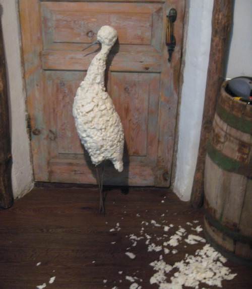З фанери вирізаємо своїми руками шаблон тулуба і крил лелеки. Шаблони скріплюються один з одним за допомогою саморізів. Пір'я – це пластикові пляшки від молока. Їх разрежем на смужки, зробимо бахрому. Смужки повинні бути однієї ширини. Беремо клейовий пістолет, пір'я кріпимо до тулуба птаха. Хвіст і нижня частина тулуба, низ крилець робимо з чорних пляшок (наприклад, з-під шампуню). Дзьоб просто обмотаємо червоною ізоляційною стрічкою. Ноги можна зробити з дроту і пофарбувати. Очки можна намалювати, а можна і купити спеціальні декоративні, в будь-якому магазині рукоділля є такі (для іграшок).