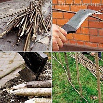 Для виготовлення такого забору можна використовувати гілки гнучкою лози, ліщини, верби і навіть дуба або сосни.