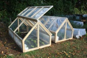 По краях грядки робиться 2 гребеня, на які укладається прямокутна дерев'яна рамка з плівкою і натягнутими в кілька рядів шнурами. Таким чином створюються прості парники своїми руками для розсади і зелені. Ще простіше застосувати прозорий ковпак з пластика. Він може сам бути одночасно укриттям і несучою конструкцією.