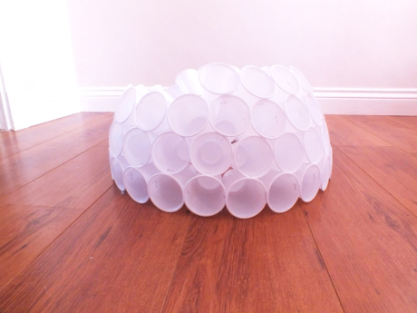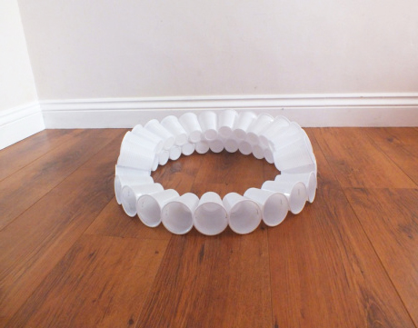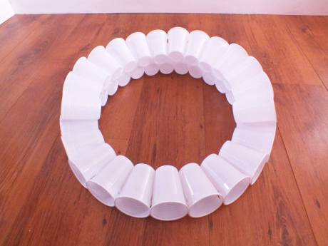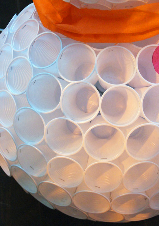 Перша деталь: тулуб. Початок його виготовлення – центральна частина сфери. Вона утворюється 25 стаканчиками. Їх потрібно було скріпити піддонами всередину. Форма посуду підкаже, як скріпити коло. Не потрібно туго скріплювати стаканчики, вони повинні розташовуватися вільно.