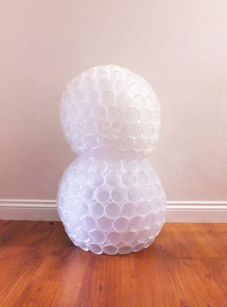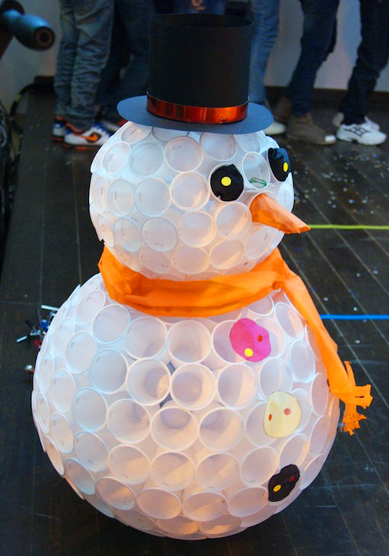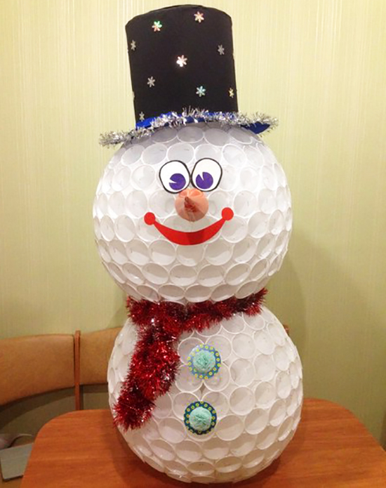Тому найбільшу і цікаву саморобку до Нового року ми пропонуємо зробити у вигляді величезного Сніговика, який до того ж відмінно себе почувати на вулиці. Робиться він з одноразових пластикових стаканчиків і може використовувати в якості вуличної новорічної вироби або для прикраси великих залів, шкіл. дитячих садків. Удома йому теж добре! А покрокова інструкція, як зробити сніговика з пластикових стаканчиків, дуже проста.