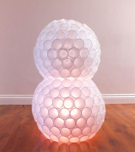 Щоб додати декоративності поделке і святкового новорічного ефекту, на підлогу під снеговиком укладіть електричну ялинкову гірлянду.Сніговик і пластикових стаканчиків буде виблискувати і переливатися, як новорічна ялинка з настанням сутінків.