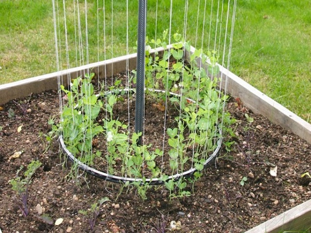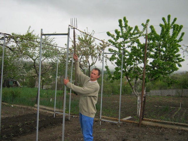 З цією метою слід викопати в грядці на відстані близько 250 сантиметрів по відношенню один до одного три виїмки, глибина яких становитиме 80 сантиметрів. У ці вириті ямки слід вставити дерев'яні бруски, після чого їх необхідно закопати максимально ретельно, при цьому утрамбовуючи грунт. Потім, до верху кожного бруска потрібно прибити дерев'яну перекладину для того, щоб конструкційно опора стала нагадувати букву «Т». Спочатку необхідно зробити три таких літери «Т», які будуть розташовуватися на грядці один за одним на ділянці або в теплиці.