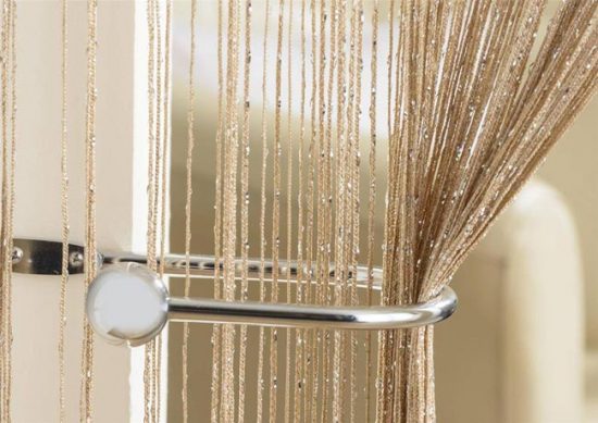 - Мотузкові (штори з нитки). Сучасні мотузкові штори – стильний, модний і яскравий декоративний елемент приміщення. Їх роблять з ниток та інших різноманітних декоративних елементів. Найчастіше в інтер'єрі можна зустріти «штори-дощ», штори з намистин і т.д. Вони створюють ефект злегка затемненого простору в кімнаті і при цьому пропускають достатню кількість світла в приміщення. Дуже часто їх вибирають креативні оригінальні люди.