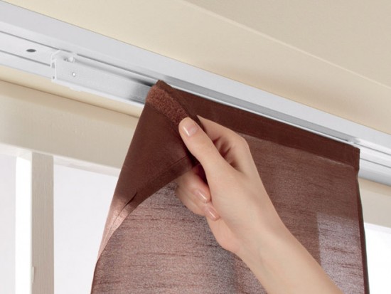 - До нижнього краю полотнища кріплять липучку. Для початку її пропрасовують праскою, прикріплюють голкою або шпилькою, а потім – пристрачивают до майбутньої штори.
