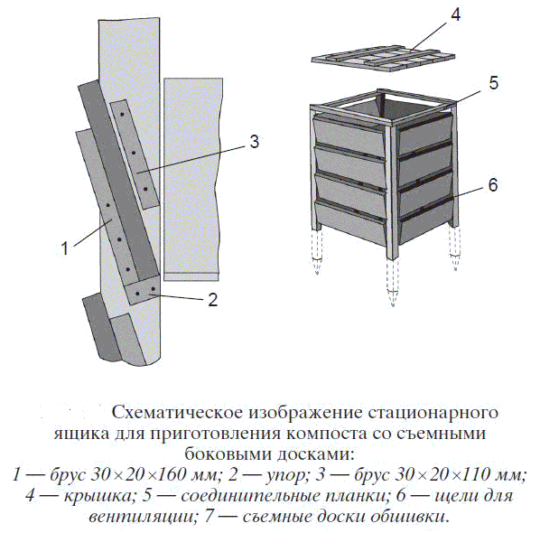 Що потрібно врахувати при виготовленні? Дозріває компосту необхідний приплив кисню, тому слід забезпечити бічні вентиляційні отвори. Обов'язково повинна бути кришка, щоб атмосферні опади не змивали корисні речовини в грунт. Інакше цінність компосту, як біодобрива, буде дорівнює нулю. Можна, звичайно, накрити ящик без кришки плівкою, але її доведеться якимось чином зафіксувати, щоб не віднесло вітром. А це не завжди зручно, та й виглядає неестетично. У нижньому шарі компост дозріває швидше, тому конструкція повинна передбачати легкий доступ до нього. Ось схематичне зображення найпростішого ящика для компосту.