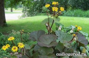 Висота такого багаторічної рослини близько 200 сантиметрів. Довжина листових пластин серцеподібної форми до 40 сантиметрів. Колосовидні суцвіття складаються з безлічі кошиків жовтого забарвлення. Цвітіння починається в серпні. Зімоустойчів, однак на зиму потребує укриття.