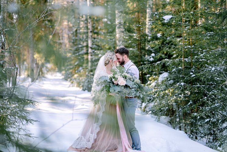 Можливо, знайдуться бажаючі відсвяткувати весілля в зимовому лісі, милуючись, як він чарівно красивий в цей час року, і з цим навряд чи хтось стане сперечатися. Але якщо ви не ризикнете провести на природі все свято, то декорувати куточок і влаштувати фотосесію в зимовому лісі цілком реально. Можна обіграти контраст білого простору і яскравого весільного букета, доповнити наряд нареченої витонченою шубкою, яскравим хусткою. Якщо є можливість, орендуйте заміський будиночок з каміном посередині зимового лісу і влаштуйте церемонію у дворі, обмінюючись клятвами посеред падаючих сніжинок. Не варто боятися експериментів – все в ваших руках, а досвідчені фахівці флористи допоможуть організувати весілля на вищому рівні, перетворивши її в незабутню подію.