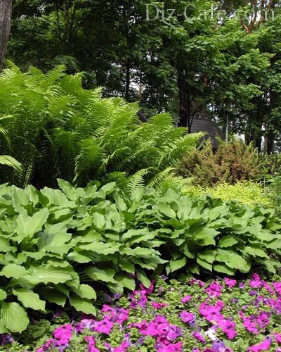 На цій клумбі хоста утворює середній ряд між петунією і папоротями. Петунію можна замінити будь-яким низькорослим багаторічників