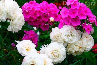 Якщо вам подобається поєднання троянд і флоксів, можна створити цікаву клумбу. Використовуючи квіти одного відтінку, їх буде навіть складно розрізнити на перший погляд, а контрастні поєднання дивно ефектні