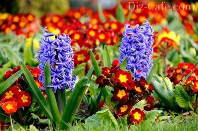 Примули цвітуть рано, коли цибулинні ще в цвіту. Можна використовувати цей момент, створюючи дивовижні поєднання кольорів на клумбі. На тлі яскравих низькорослих примул гіацинти виглядають ніжно і незвично