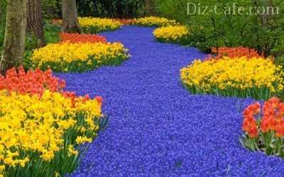 Весняне пишність з тюльпанів, нарцисів та мускари. По краях алеї з мускари висаджені острівці тюльпанів і нарцисів. Якщо місця в саду мало, навіть невеликі групи цих квітів перетворять будь-який садовий куточок