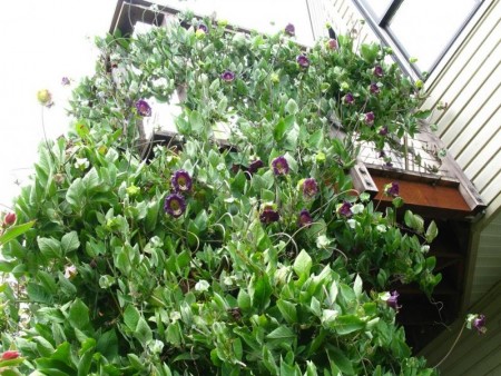 - Чудові балкони, прикрашені Кобе.Хоча домогтися від неї цвітіння в таких умовах непросто, зачаровує її потужна зелень, а квітів можуть додати ампельні сорти інших рослин.