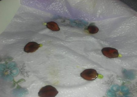 - Взяти невелику ємність, накрити вологою серветкою, розкласти насіння і підливати води, не допускаючи висихання. Ємність повинна стояти в теплому місці. Перші корінці з'являються через 12-15 днів.