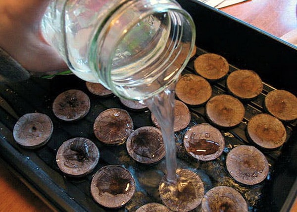 - тепер таблетки можна розмістити на дні контейнера і налити в нього трохи відстояною, теплою (не гарячою) води. В середньому на один спресований кокогрунт потрібно 35-40 мл рідини, зайву воду зливають;